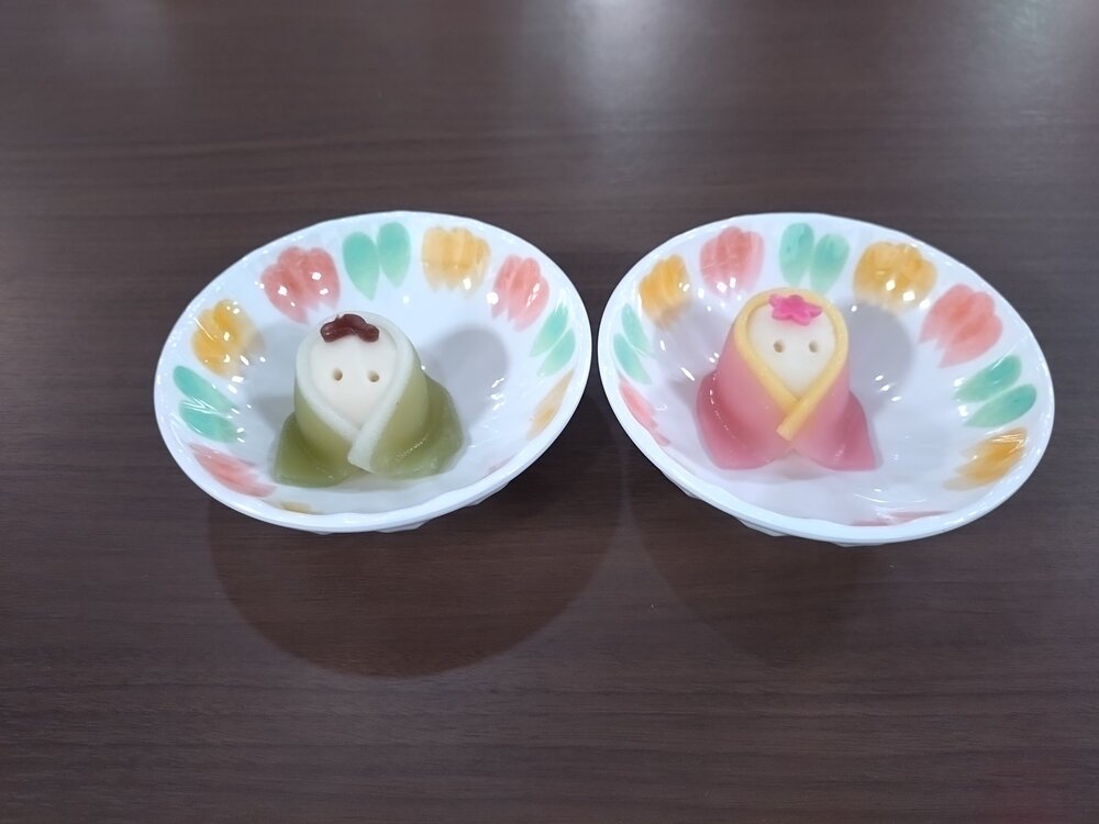 当日は、完成した作品を手に記念撮影を行った後、ひな祭りにちなんだ和菓子をご提供。