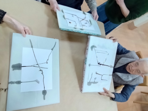 息を吹きかけたりしながら、偶然生まれる線や模様を楽しみます。