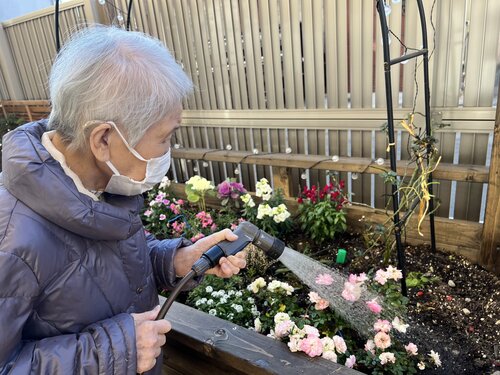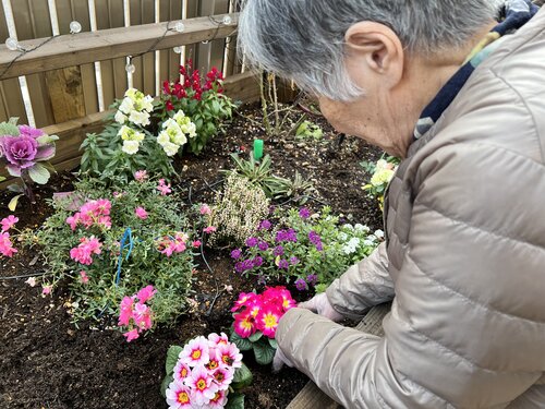 ホームのウッドデッキにある花壇では、水やりや植え替えを行いました。