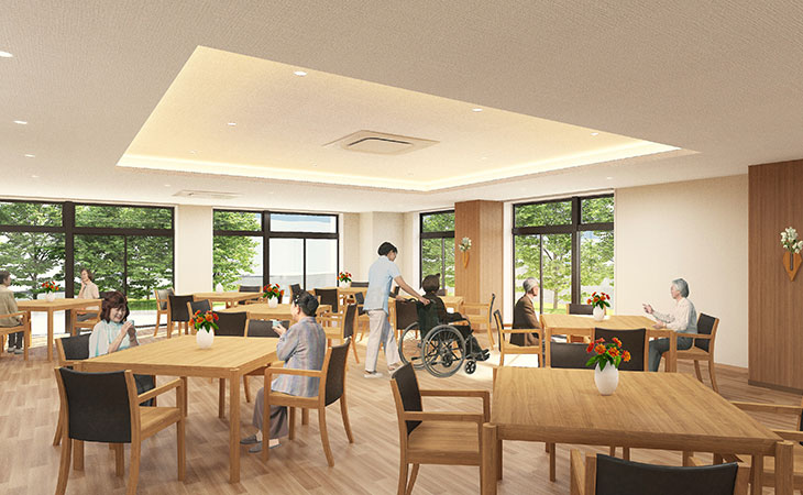 | 共用設備 | エントランス、ラウンジ、事務室、健康管理室、面談室、ダイニング、ファミリーダイニング、リビング、厨房、理美容室、リハビリルーム、浴室(一般浴・機械浴)、湯上りスペース、ルーフバルコニー、共用トイレ、エレベーター2基、洗濯室、汚物処理室、スプリンクラー、火災通報装置 等 |