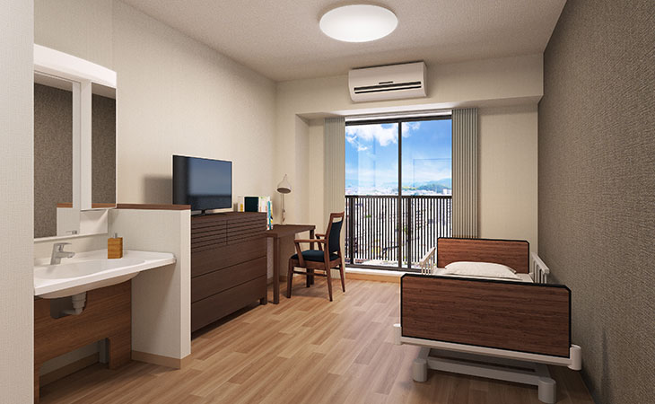 | 居室設備 | 介護用電動ベッド、寝具、冷暖房、カーテン、クローゼット、トイレ(全居室完備、洗浄機付)、電動昇降洗面台、照明、見守りセンサー、消防設備(自動火災報知設備、スプリンクラー)、テレビ回線、ナースコール(2カ所/トイレ・ベッド) |