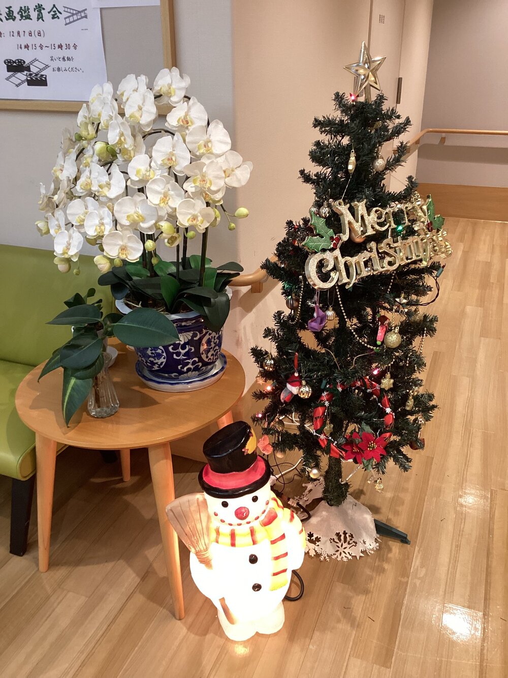ホームの玄関入口前に、ご入居者からお預かりした造花の胡蝶蘭を飾らせていただきました。