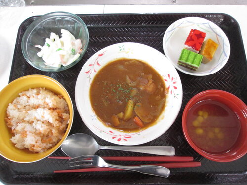 メニューは、鮭ご飯、ブラウンシチュー、マカロニサラダ、コンソメスープ。