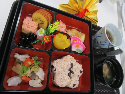 お赤飯にお吸い物、お煮しめに伊達巻き、黒豆、蒲鉾など、新年の始まりにふさわしい献立です。