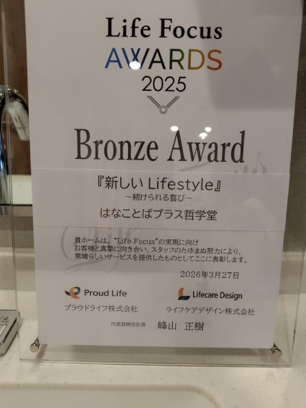 そうした中、このたび当ホーム「はなことばプラス哲学堂」は、『Bronze Award』 を受賞いたしました。