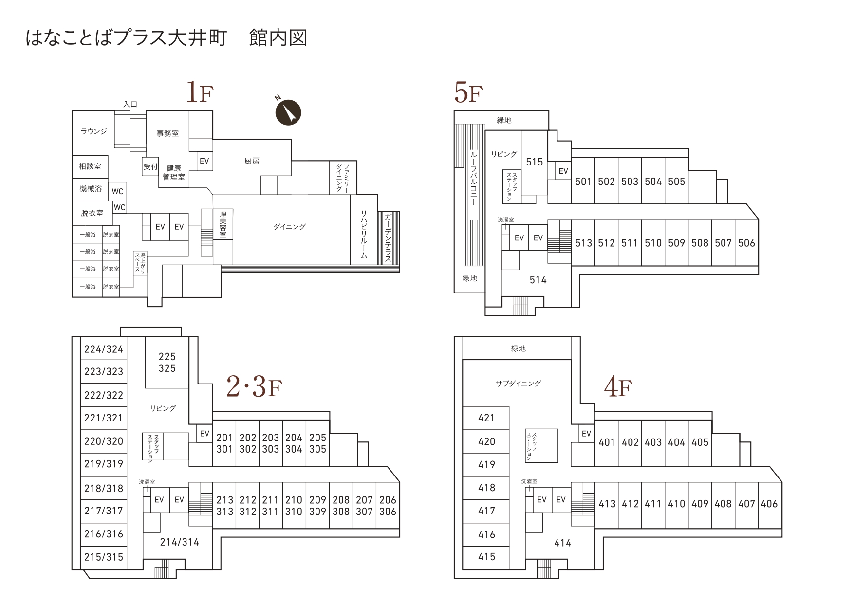 | 共用設備 | エントランス、ラウンジ、事務室、健康管理室、相談室、ダイニング、ファミリーダイニング、厨房、理美容室、リハビリルーム、ガーデンテラス、浴室(一般浴槽・機械浴槽)、湯上りスペース、共用トイレ、エレベーター2基、リビング、サブダイニング(4階)、ルーフバルコニー、汚物処理室、スプリンクラー、火災通報装置 等 |